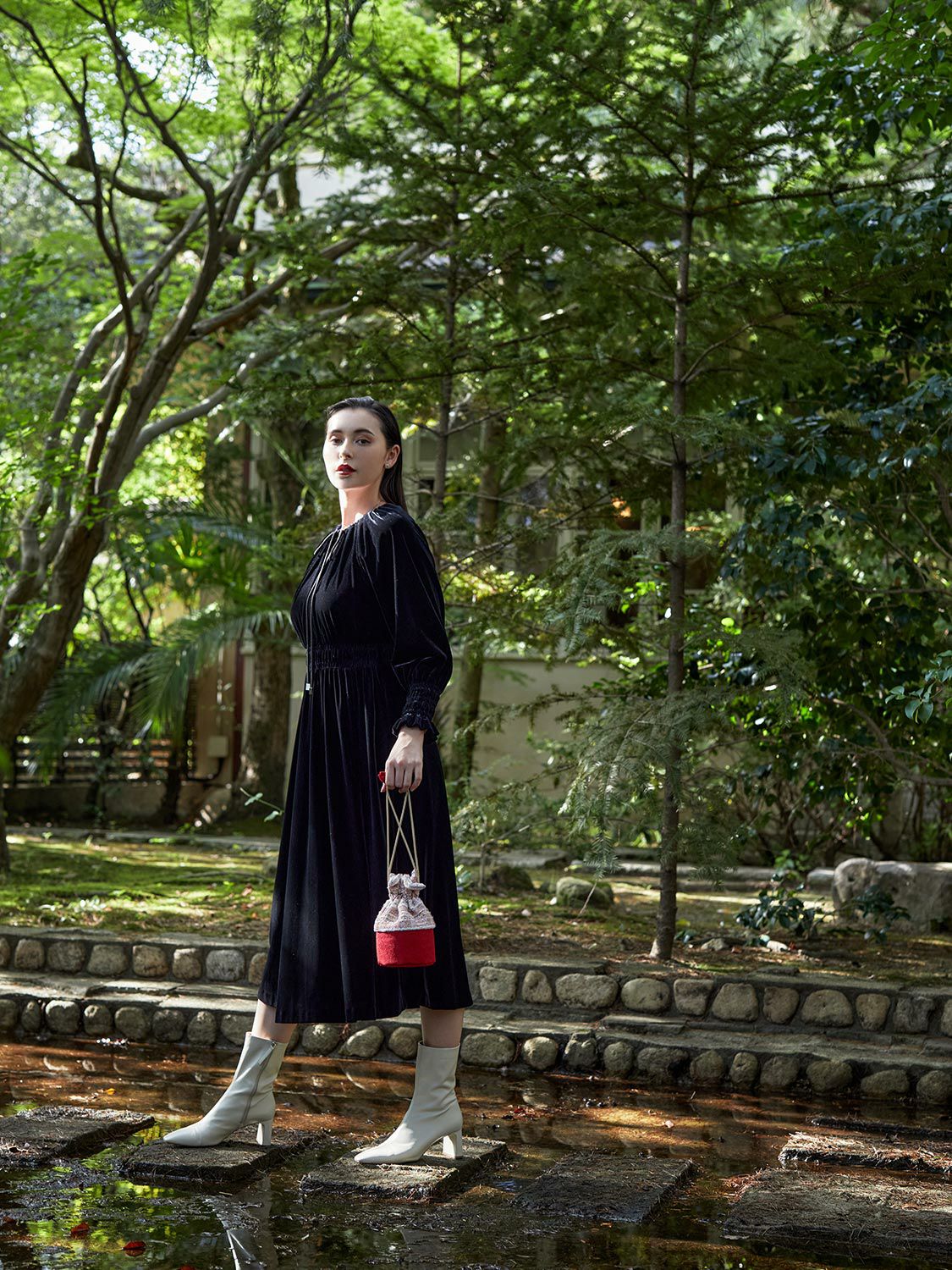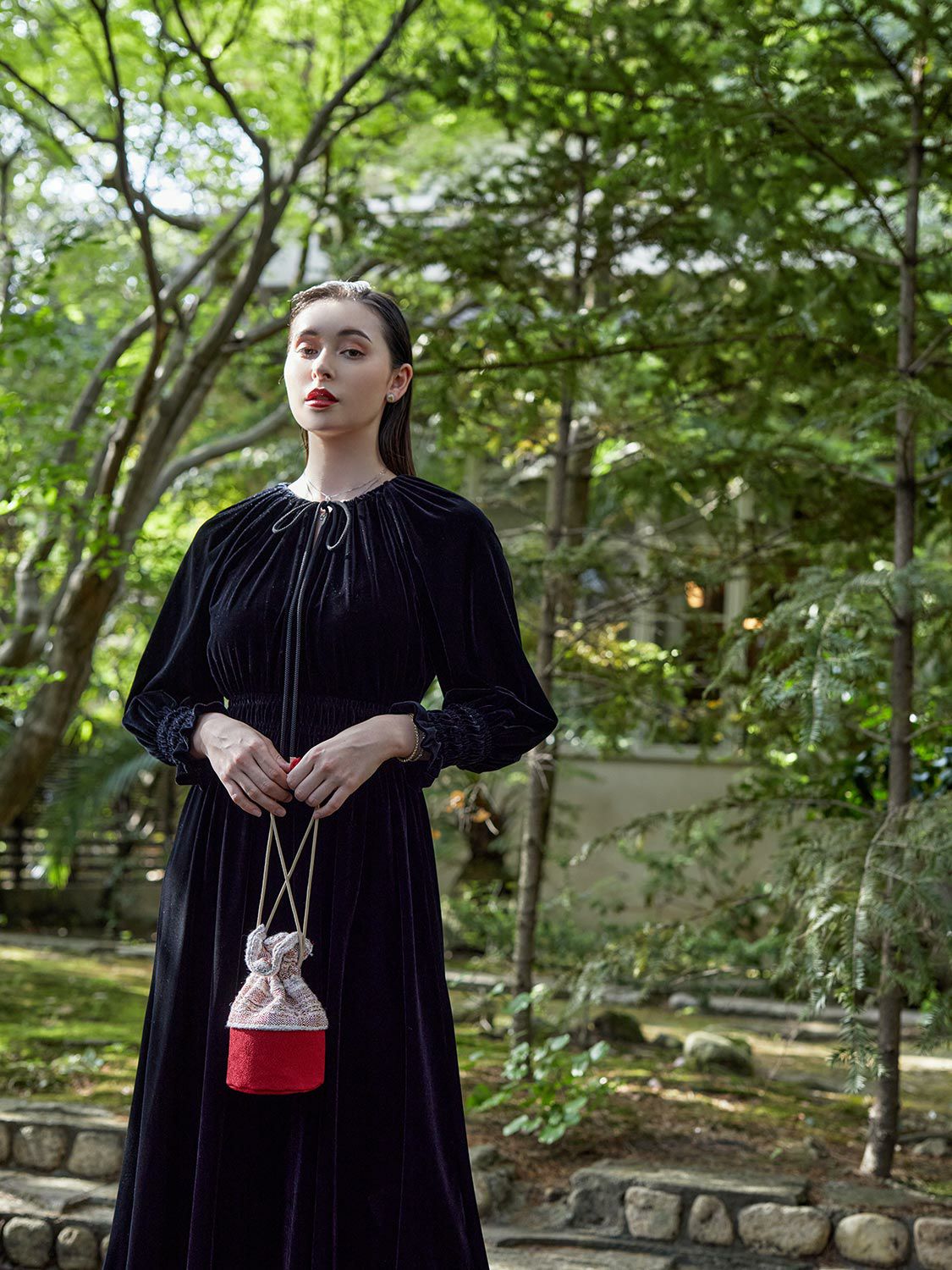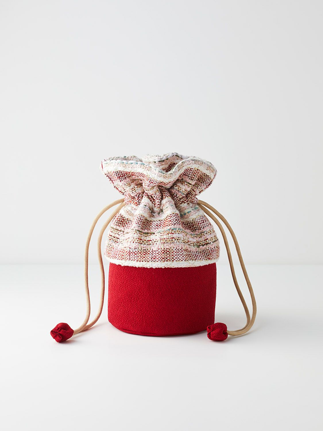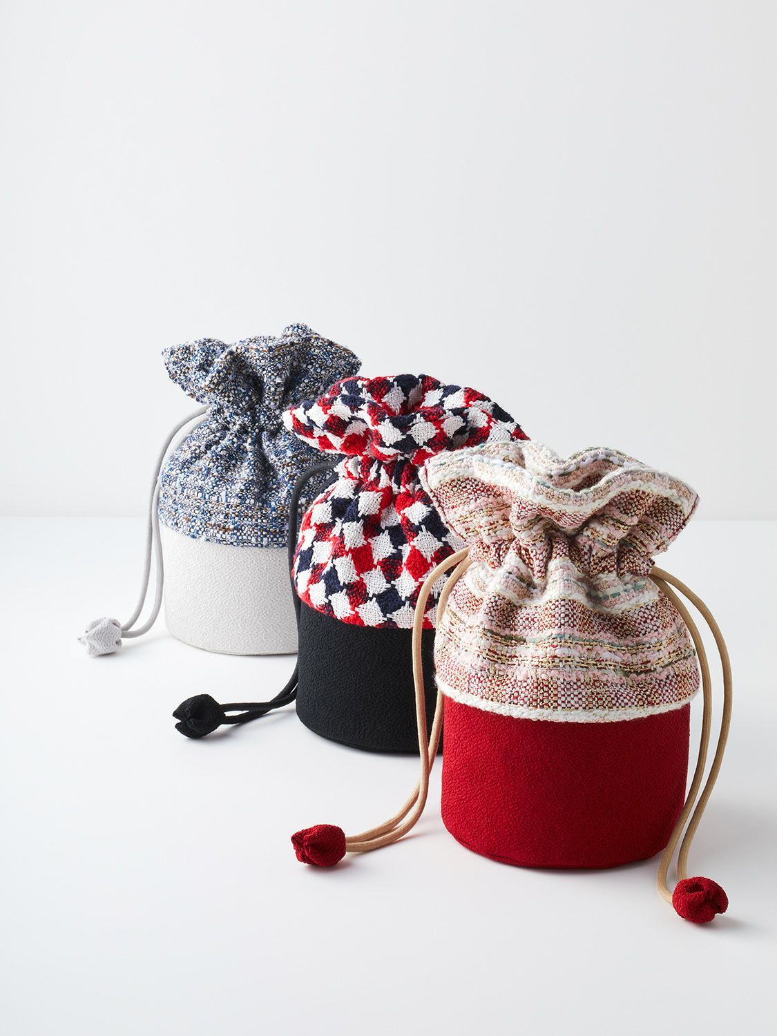 特別な茶会のお席では無く、日常にお薄を頂き「癒し」を感じる時間が持つ事で心が安らぎ、ゆとりを感じる。格式高いしきたりの中ででは無く、ご自身をご自愛頂く「癒しの一腹」として、お気に入りの場所で、海外の旅先で、紅葉や、花見の下で、野点をファッションのように楽しめたらという想いでお作り致しました。日常に持ち運んで頂きたく、茶道具入れを巾着型にし、お生地には洋服生地のツイード(リントン社ツイード/市松、インポートツイード/梅・風)を使用致しました。
