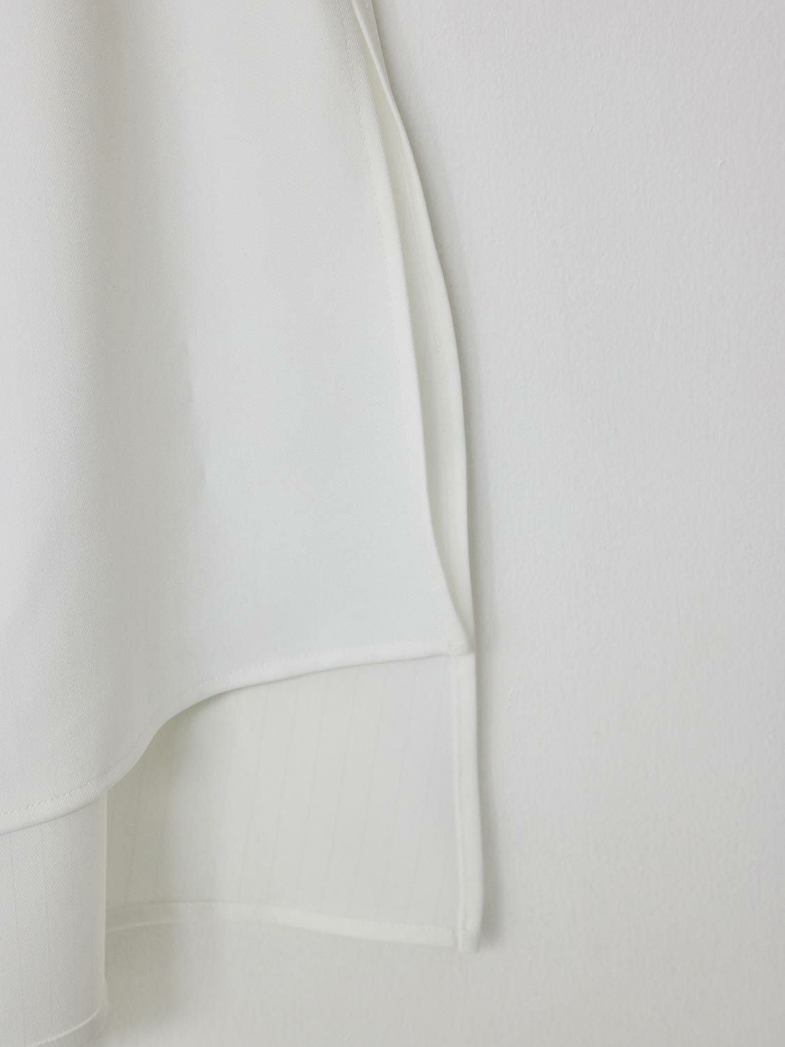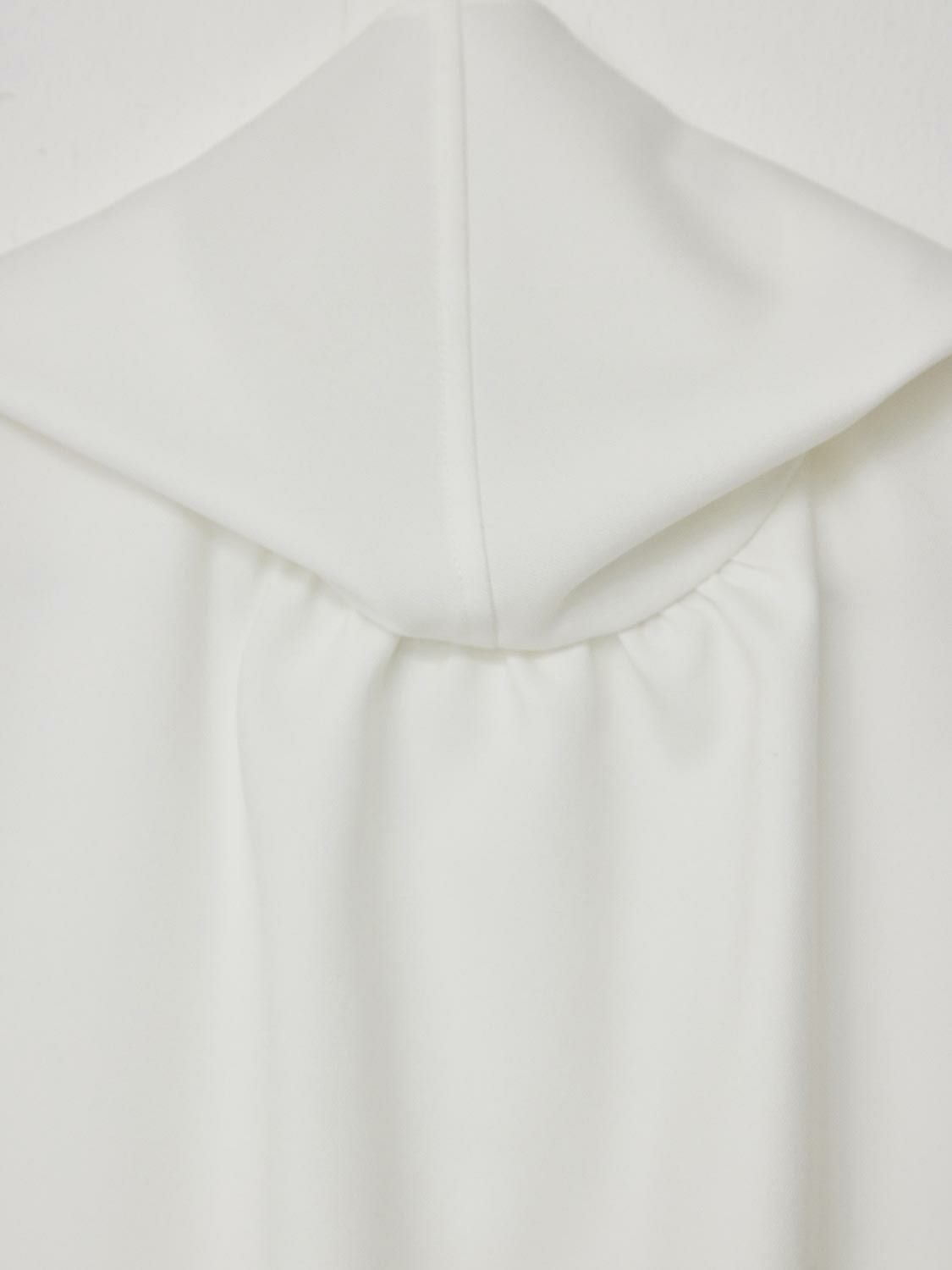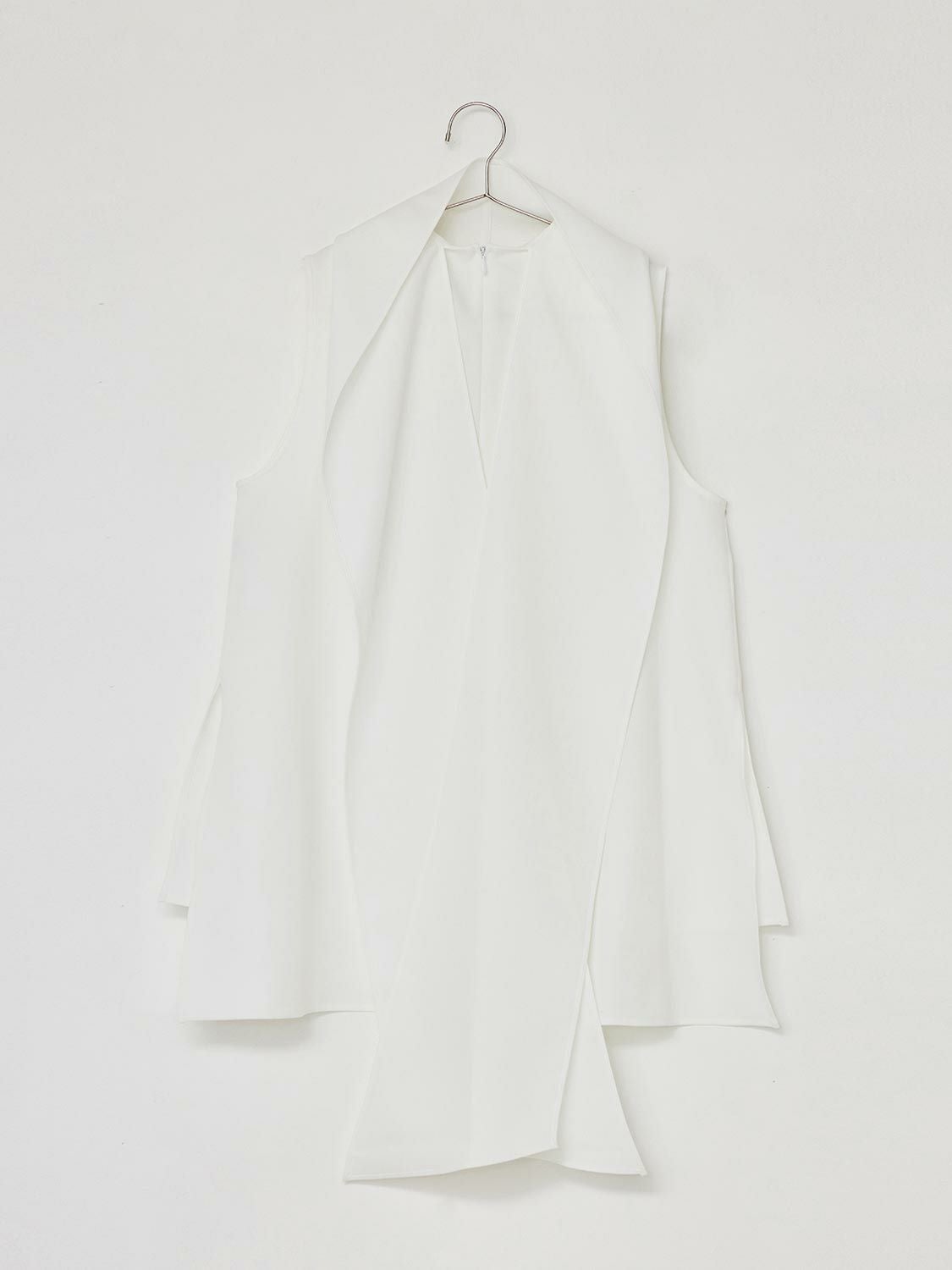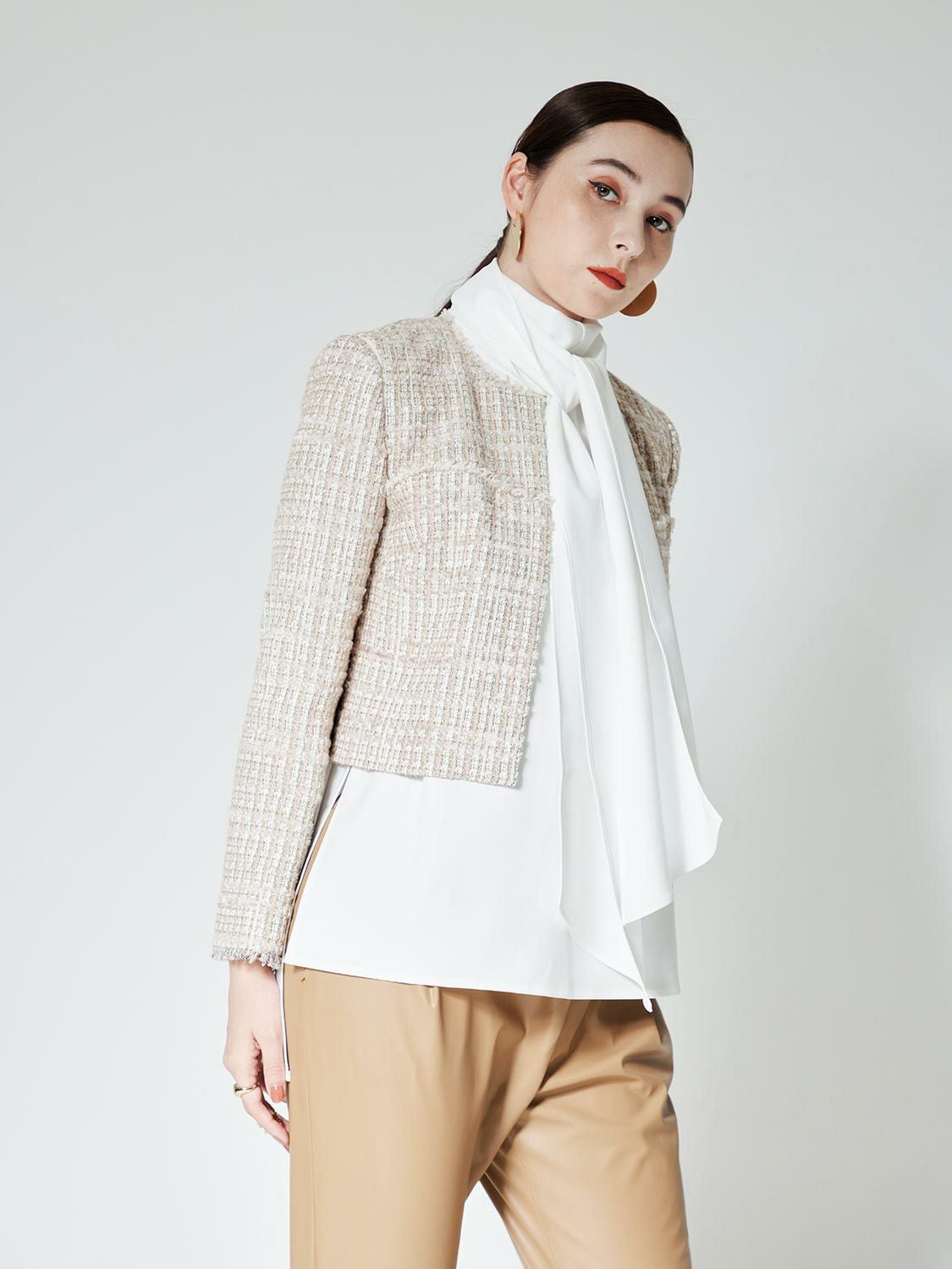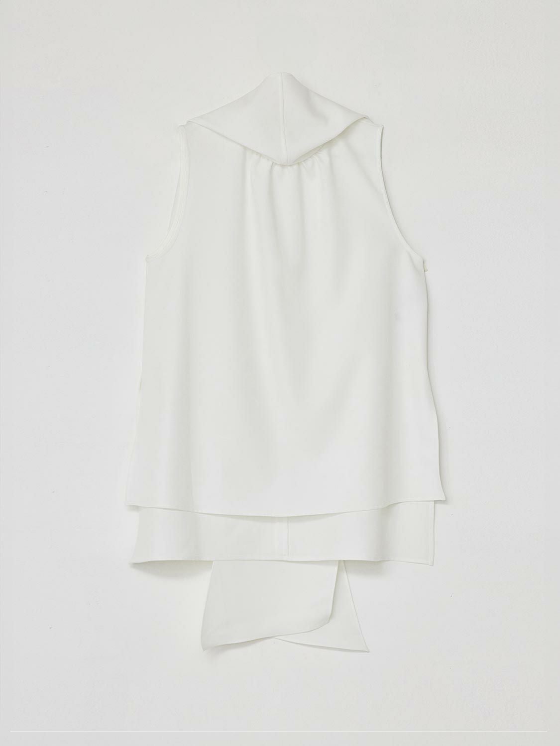 張り感と光沢感ある生地でお作りしたトップス。身体のラインを拾わずヒップが隠れる丈ですので安心してコーディネートを楽しんで頂けます。ボウタイ部分は1ヶ所で縫い付けているため取り外しは出来ませんが、リボン結びや1回結び、スカーフのように流したりと、様々なアレンジ方法がありますのでその日の気分でお楽しみください。1枚でのスタイリングはもちろん、カーディガンやジャケット内のアクセントインナーしても重宝する万能アイテムです。