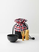 特別な茶会のお席では無く、日常にお薄を頂き「癒し」を感じる時間が持つ事で心が安らぎ、ゆとりを感じる。格式高いしきたりの中ででは無く、ご自身をご自愛頂く「癒しの一腹」として、お気に入りの場所で、海外の旅先で、紅葉や、花見の下で、野点をファッションのように楽しめたらという想いでお作り致しました。日常に持ち運んで頂きたく、茶道具入れを巾着型にし、お生地には洋服生地のツイード(リントン社ツイード/市松、インポートツイード/梅・風)を使用致しました。