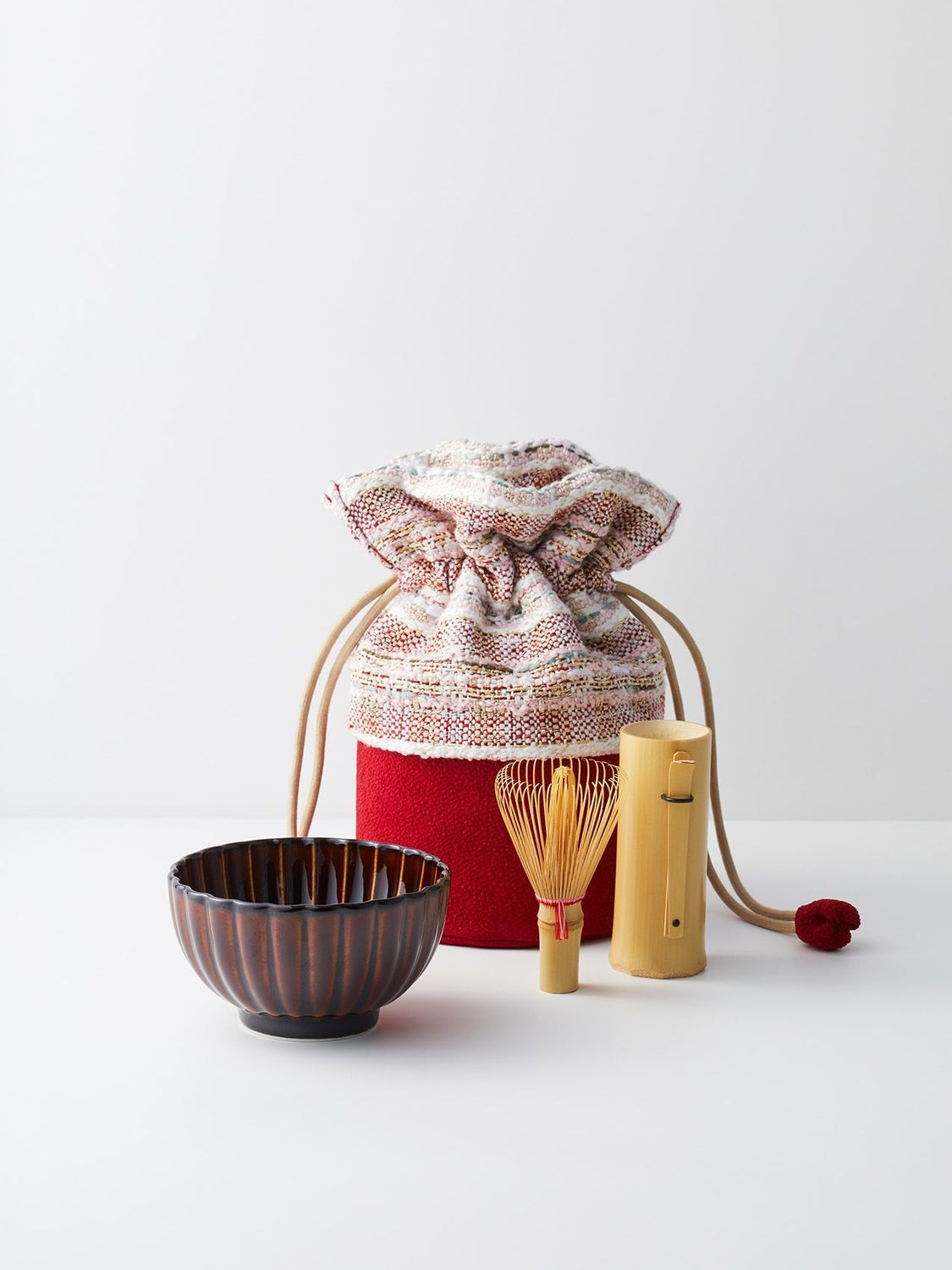 特別な茶会のお席では無く、日常にお薄を頂き「癒し」を感じる時間が持つ事で心が安らぎ、ゆとりを感じる。格式高いしきたりの中ででは無く、ご自身をご自愛頂く「癒しの一腹」として、お気に入りの場所で、海外の旅先で、紅葉や、花見の下で、野点をファッションのように楽しめたらという想いでお作り致しました。日常に持ち運んで頂きたく、茶道具入れを巾着型にし、お生地には洋服生地のツイード(リントン社ツイード/市松、インポートツイード/梅・風)を使用致しました。