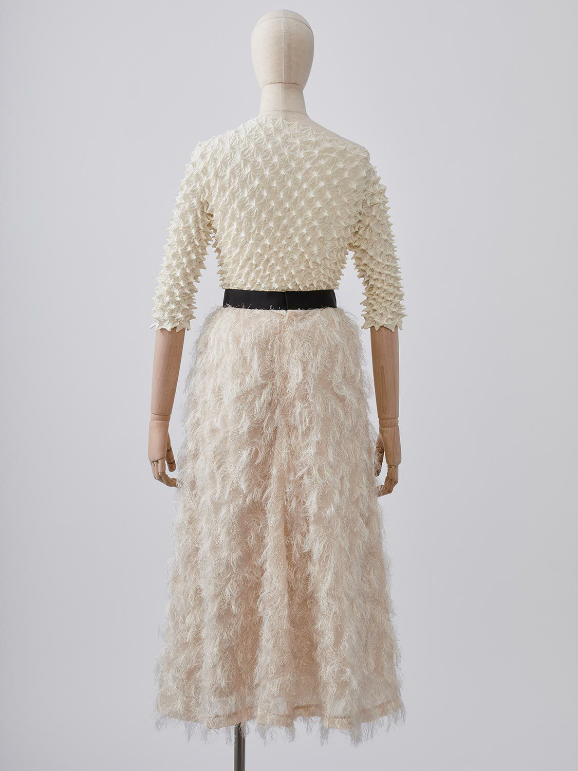 ボリュームのあるフリンジ生地のスカートで日常に華やかさを。シンプルなニットやブラックジャケットと合わせて頂いたり等スタイリングのアクセントになるお品です。ウエストは黒の生地できちんとウエストマークしているので、ボリュームのあるフリンジですがスタイルバランス良くお召し頂けます。