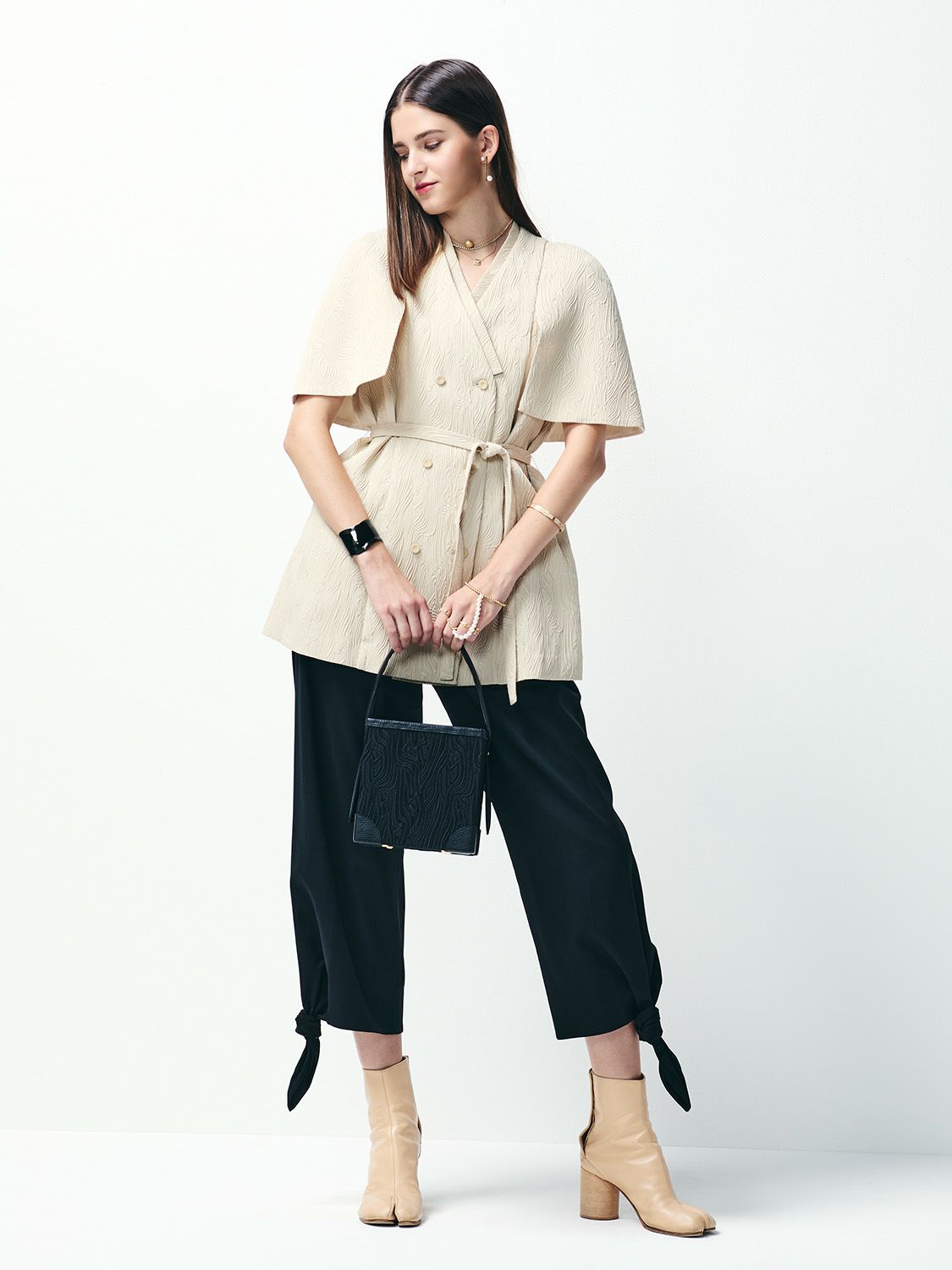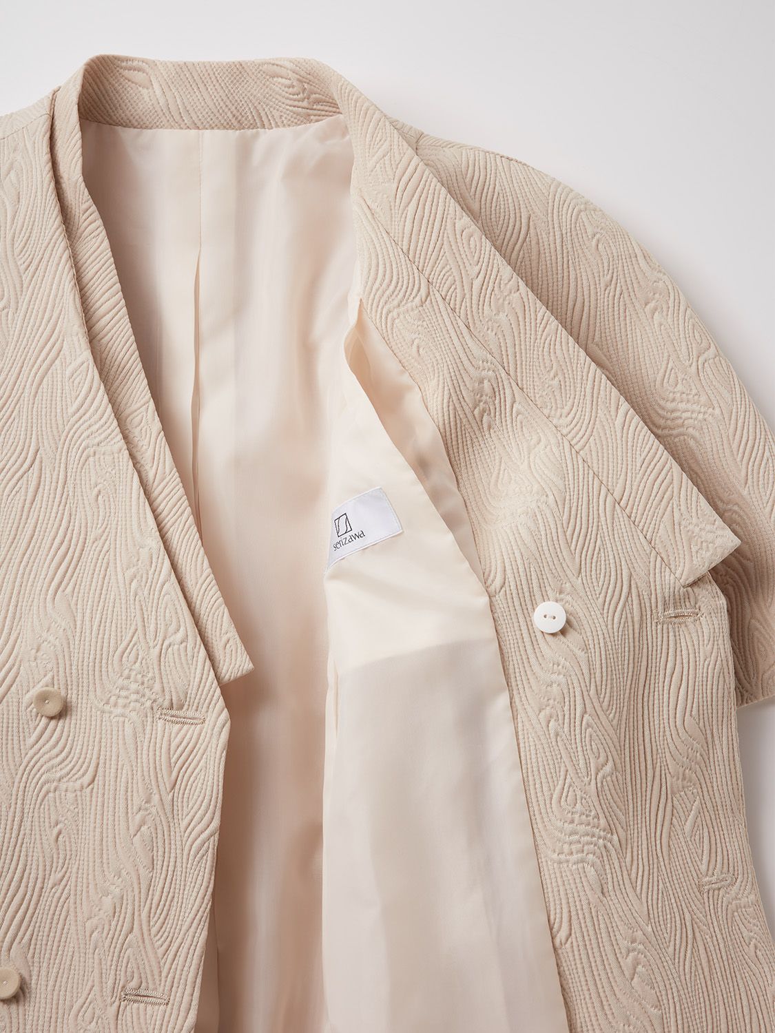 お着物を着装した、「凛」と佇む日本女性をイメージしてお作りしたトップス。着物の半衿をイメージした二重襟の胸元のデザインが特徴的で御座います。流木のようにゆったりと流れるような立体的な細かいステッチ縫いが美しく、ラグジュアリーな装いを演出してくれます。またお袖に入ったスリットにより、女性らしさを感じさせてくれます。お洋服としてはもちろん、お着物のようにお召しいただけるよう左側を上前身頃としても着用していただける2way式のお作りとなっております。また、左胸には大きめの内ポケットをおつけしており、帛紗や懐紙を入れて頂けるようお作りしております。背中にボックスタックをお入れてしておりますので、サイズレスでゆったりとお召し頂けます。 左胸内側ポケット有り / 前開きボタン式