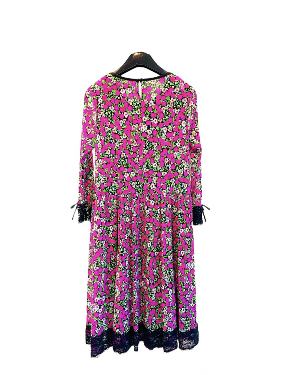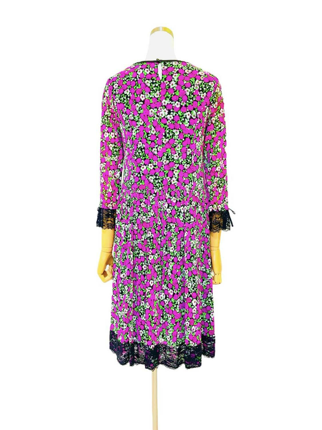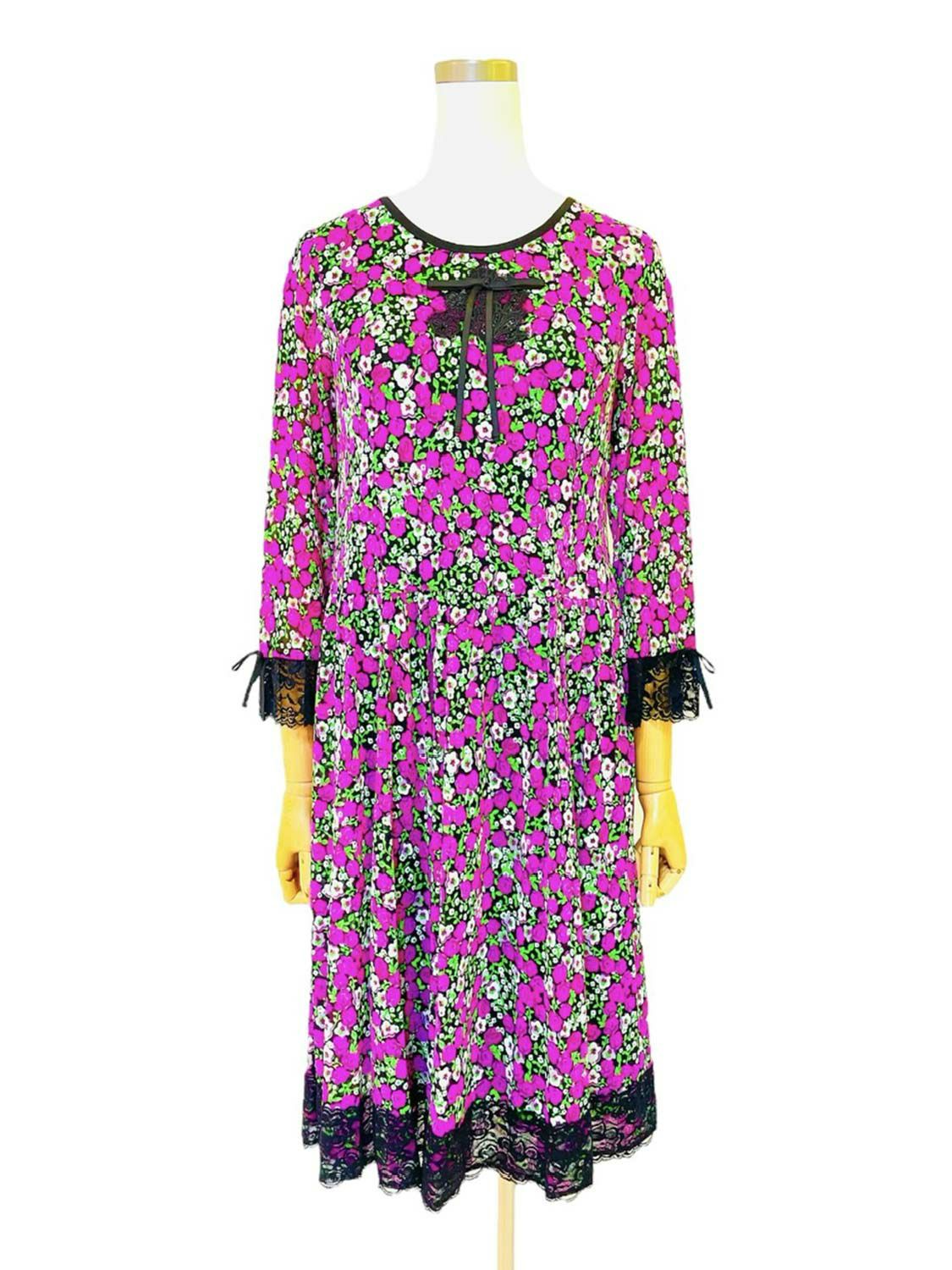 色見が目を惹くパワーネット素材を使用した伸縮性抜群のワンピース。 小花の総柄ながらも胸元のレースリボンや袖と裾元のレースでドレッシーに。 ウエストより下にかけてタックがはいりシルエットの変化も魅力。