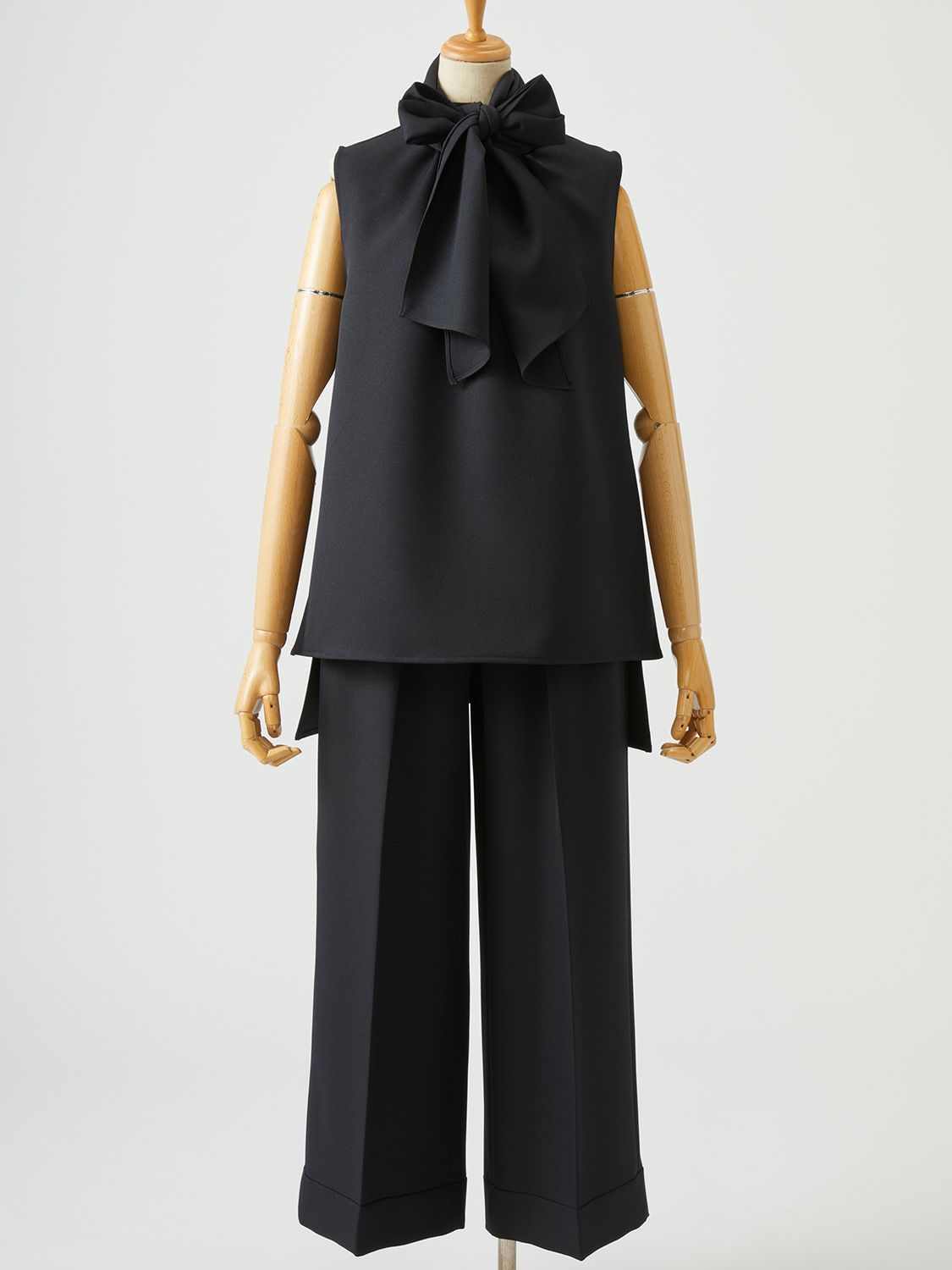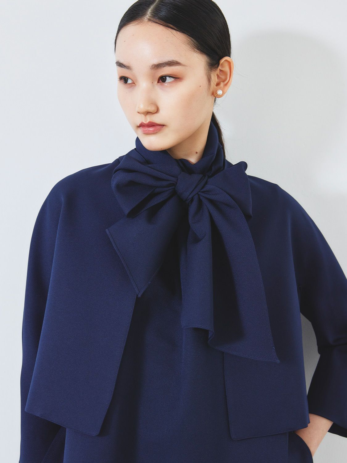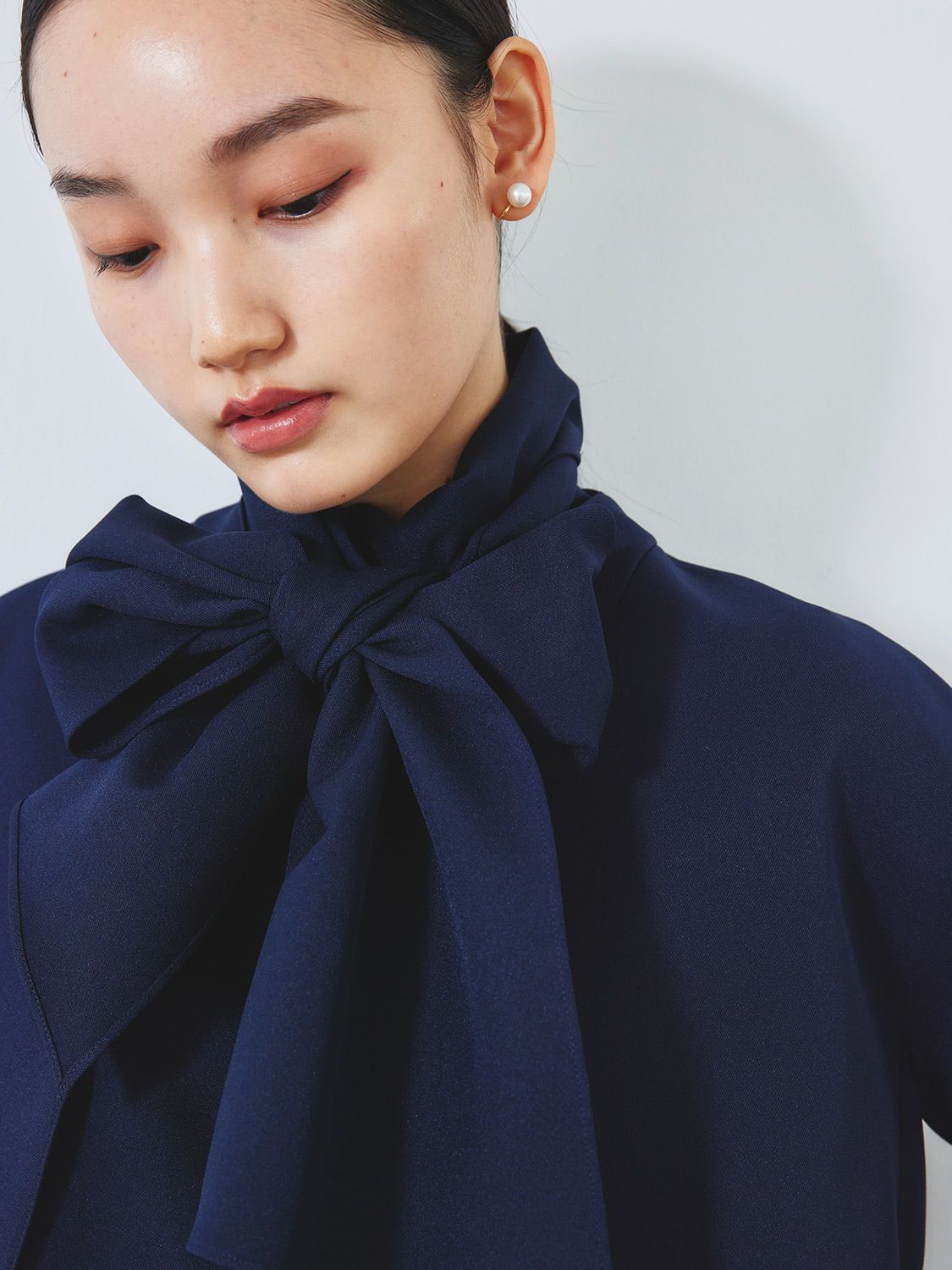 大きなボウタイが印象的なトップス。 身体のラインを拾わずヒップが隠れる丈ですので安心してコーディネートを楽しんで頂けます。 ボウタイ部分は1ヶ所で縫い付けているため取り外しは出来ません。リボン結びや1回結び、スカーフのように流したりと、様々なアレンジ方法でお楽しみいただけます。 お生地はきちんと張り感のある微光沢でお作りしておりますので、エレガントで高級感のあるブラウスとしてお召し頂けます。 別売りのボレロジャケットと袴パンツ合わせてお召し頂きましたらスーツとしてもご活用頂けます。