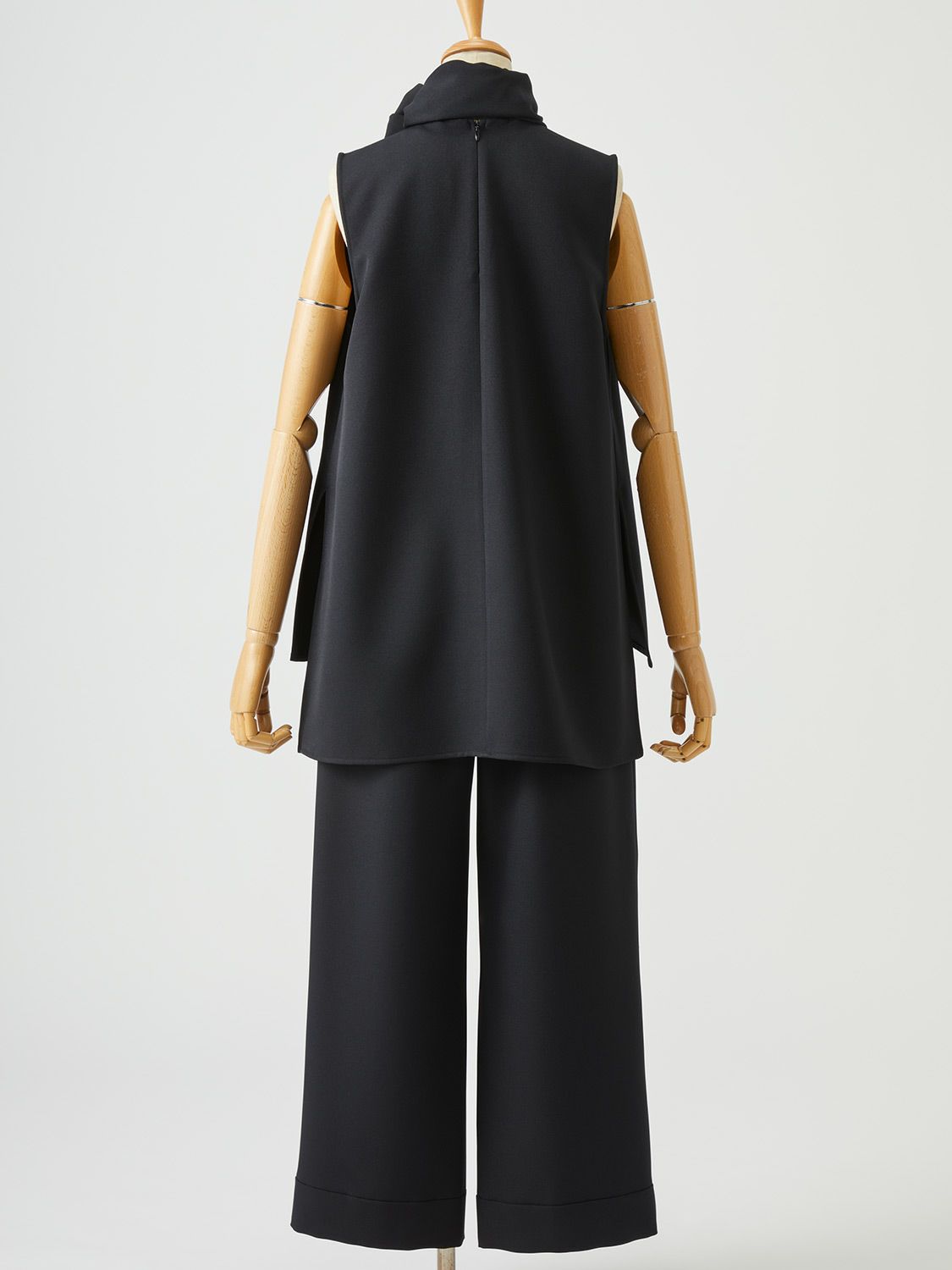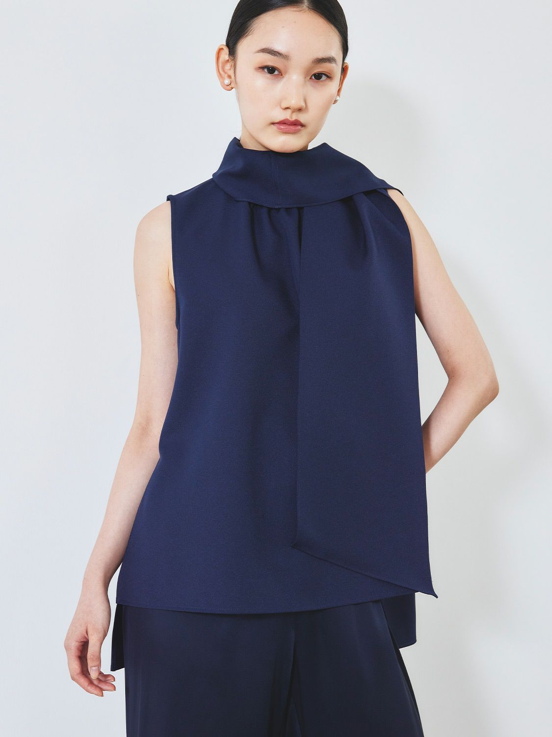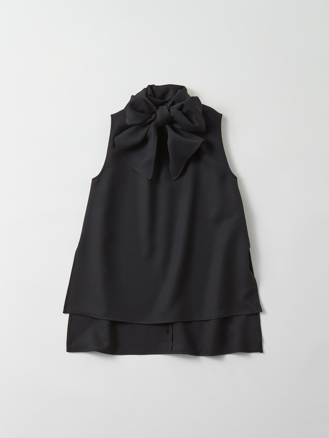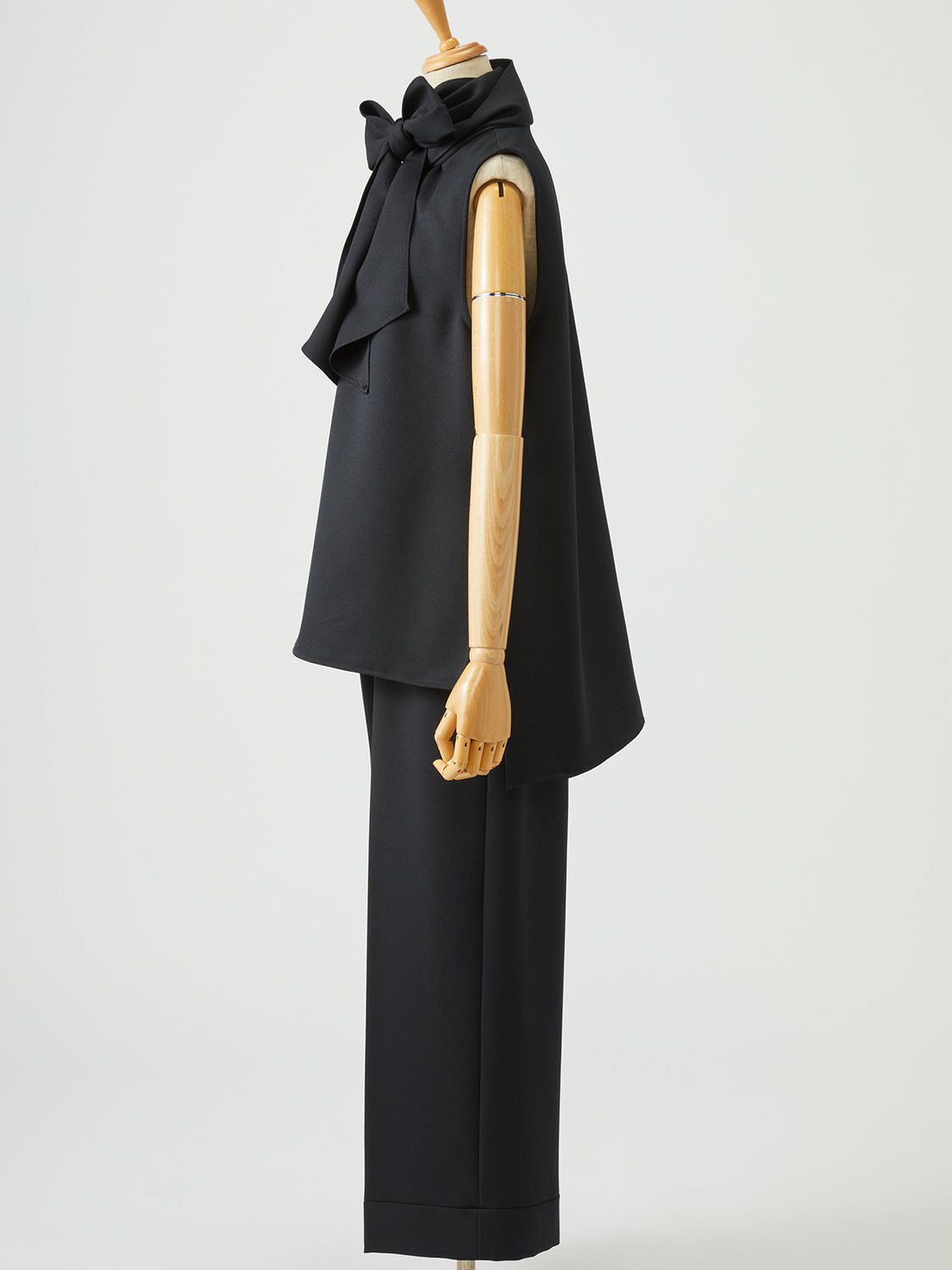 大きなボウタイが印象的なトップス。 身体のラインを拾わずヒップが隠れる丈ですので安心してコーディネートを楽しんで頂けます。 ボウタイ部分は1ヶ所で縫い付けているため取り外しは出来ません。リボン結びや1回結び、スカーフのように流したりと、様々なアレンジ方法でお楽しみいただけます。 お生地はきちんと張り感のある微光沢でお作りしておりますので、エレガントで高級感のあるブラウスとしてお召し頂けます。 別売りのボレロジャケットと袴パンツ合わせてお召し頂きましたらスーツとしてもご活用頂けます。